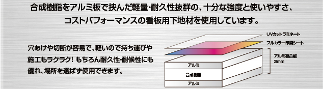 プレート看板は、合成樹脂をアルミ板で挟んだ軽量・耐久性抜群の、充分な強度と使いやすさ、コストパフォーマンスの高い下地材を使用しているため、製作や穴あけ・切断が容易で持ち運びも施工もラクラク。